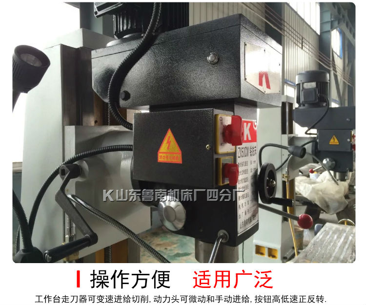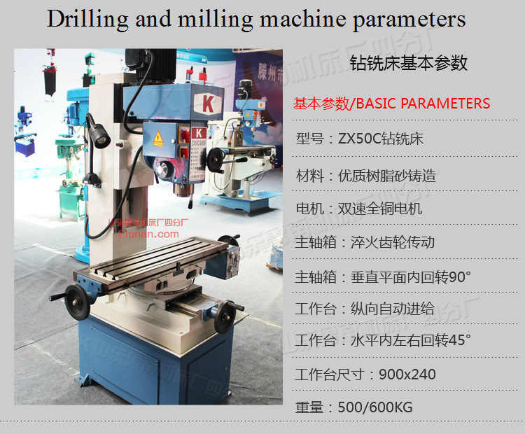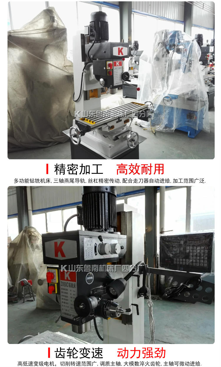 ZX50C/ZX50CM多功能鉆銑床綜合銑床、鉆床主要特點設計,具有銑、鉆、鏜、磨、攻絲等多種切削功能,主軸箱為齒輪傳動,齒輪采用磨齒經高頻淬火處理,噪音低,經久耐用。可垂直平面內左右回轉90°,工作臺面積可在水平面內垂直縱橫移動,又可左右回轉45°,工作臺配有機械進給器,可實現工作臺縱向自動進給,提高加工精度和表面光潔度。主軸配有微動進給機構,可進行平面、凹槽、螺旋面、斜面、花鍵、齒輪等的加工,結構簡單,操作靈活,廣泛用于單件或是成批的機械制造。